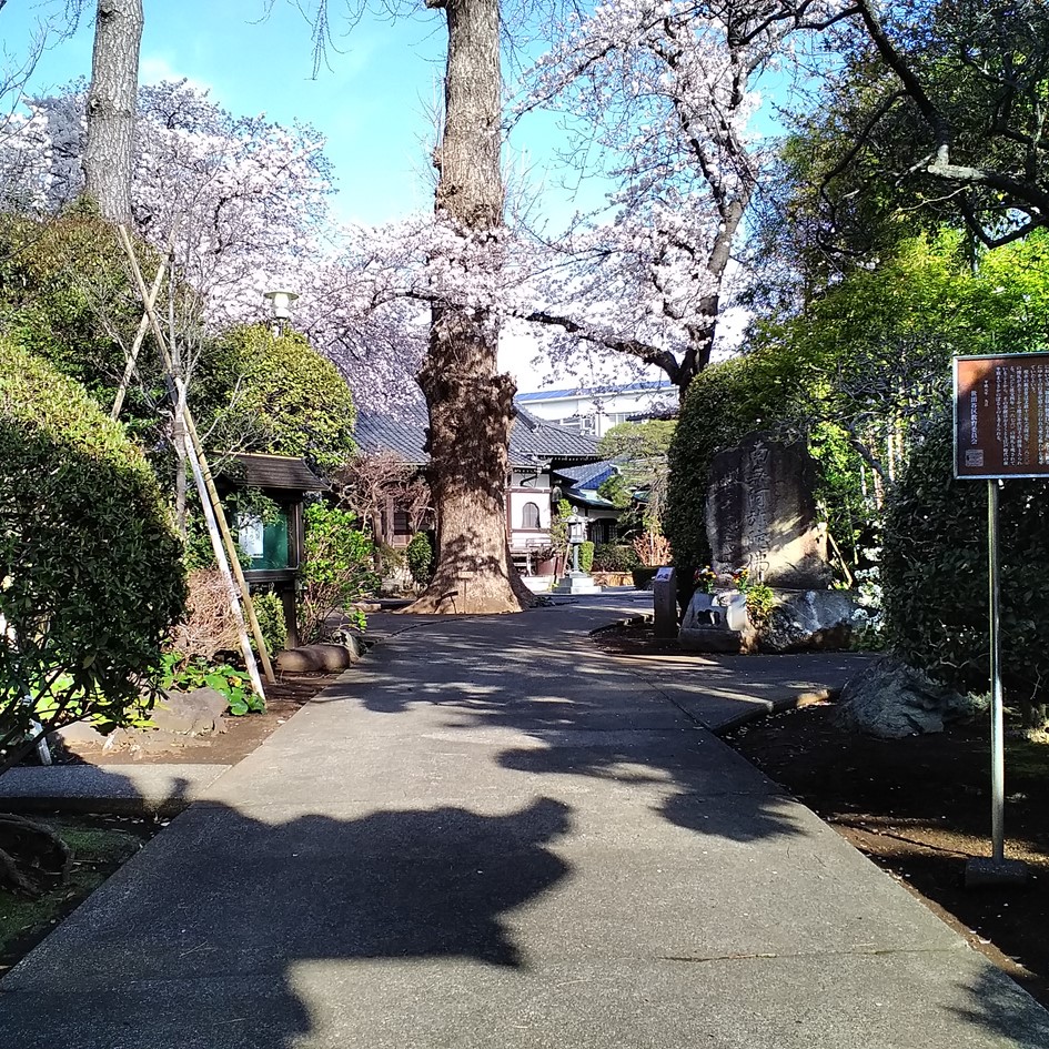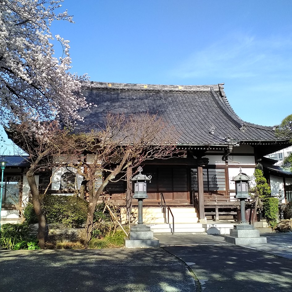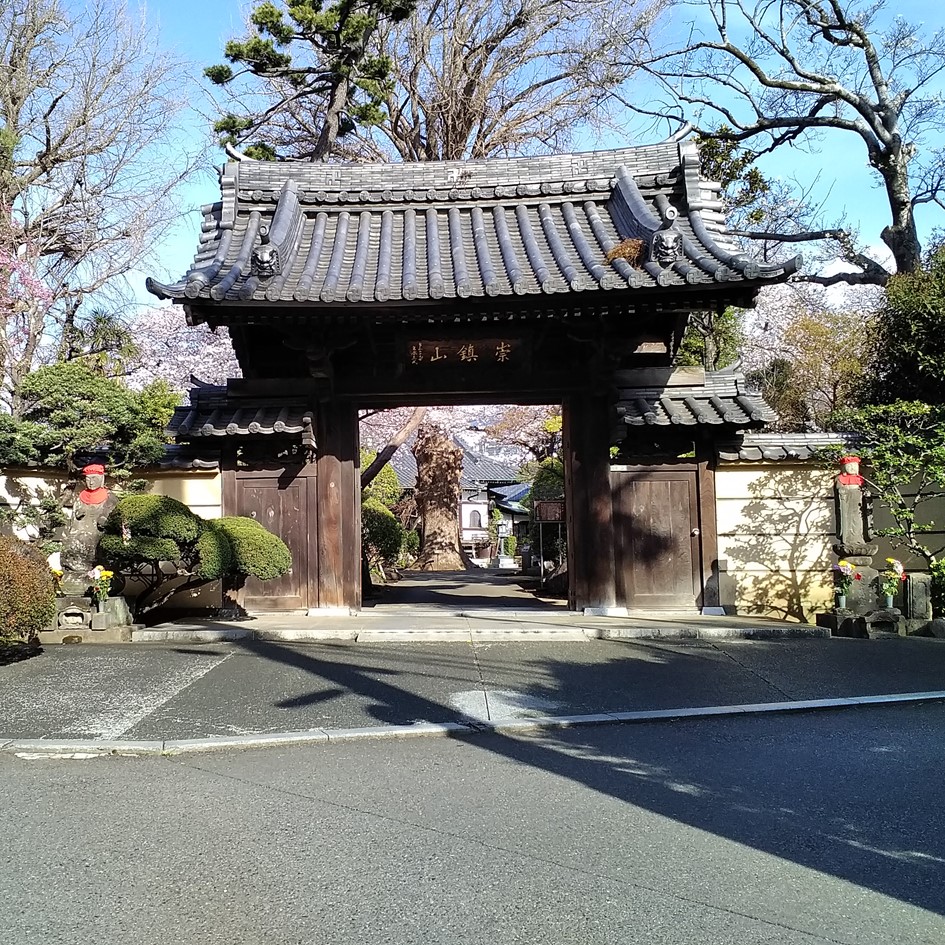 用賀駅徒歩2分。駅、住宅街のそばにありながら静かな趣のある寺院です。山門を入ると、大きな銀杏の木がお参りの方を迎えています。